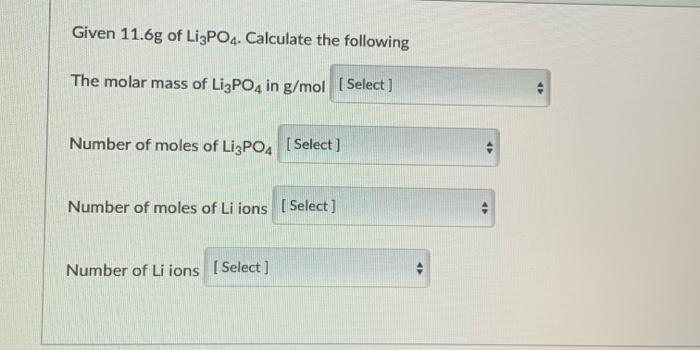 Pdf Beyond Garnets Phosphates And Phosphosulfides Solid Electrolytes New Ceramic Perspectives For All Solid Lithium Metal Batteries from i1.rgstatic.net Calculate the molar concentration of lithium ions. If this reaction were to occur, #310 g lino_3# would be needed to make #250 g li_2so_4#. To calculate a molar mass, we simply sum up the contributions of each element or atom. Molar mass calculator computes molar mass, molecular weight and elemental composition of any given compound. Li3po4 is a white crystal at room temperature. Concerning li3fe2(po4)3, n = 2. Calculate the mass of lithium hydroxide needed to absorb 12 dm3 of carbon dioxide. Lithium is a chemical element with the symbol li and atomic number 3.
